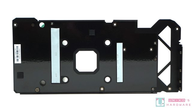 金屬背板的底部,有 2 塊長形的導熱貼,直觸顯示卡 PCB 背後的貼片式輸出電容 SPCAP。