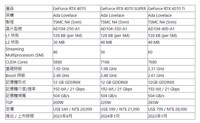 左下方可看到 RTX 4070 SUPER 和 RTX 4070 一樣,都只有 12 GB 記憶體容量 (位元是 19