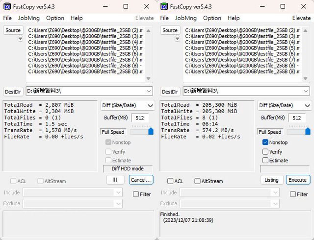 ▼第3次FastCopy複製,起始速度1578MB/s,結束速度574.2MB/s,耗時6分14秒