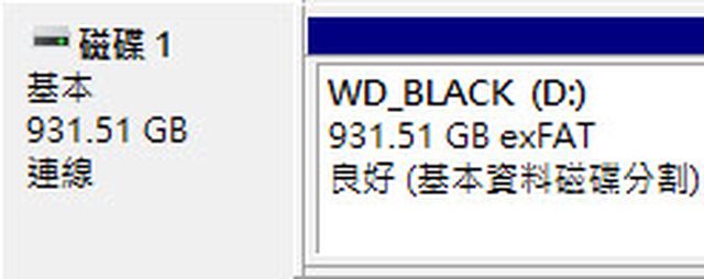 ▼預設磁碟標籤WD_BLACK,預設格式exFAT,在Windows磁碟管理內實際可用容量為