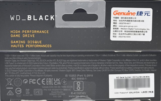 ▼外盒上/下側面有WD_BLACK字樣、HIGH-PERFORMANCE GAME DRIVE字樣、代理商貼紙、額