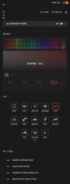 ▼RGB照明設定頁,可新增/重新命名/刪除設定檔,選取顏色(顏色快選/調色盤/RGB數值)