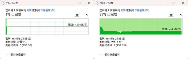 ▼第4次作業系統檔案複製,起始速度1.1GB/s,約在5%(15GB)處降速到504MB/s直到結束