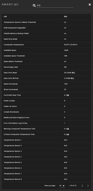 觀、磁碟標籤、磁碟代號、裝置名稱、韌體版本、已使用容量長條圖、健康狀態、容量(