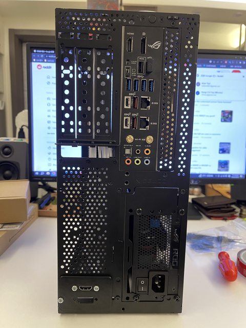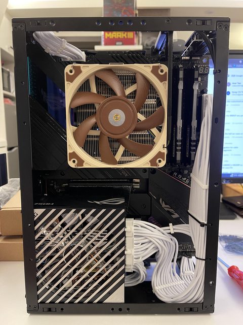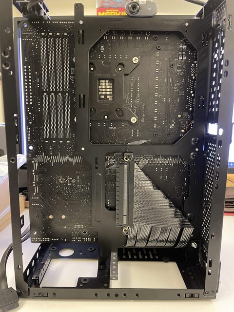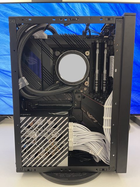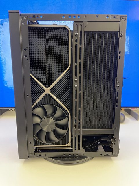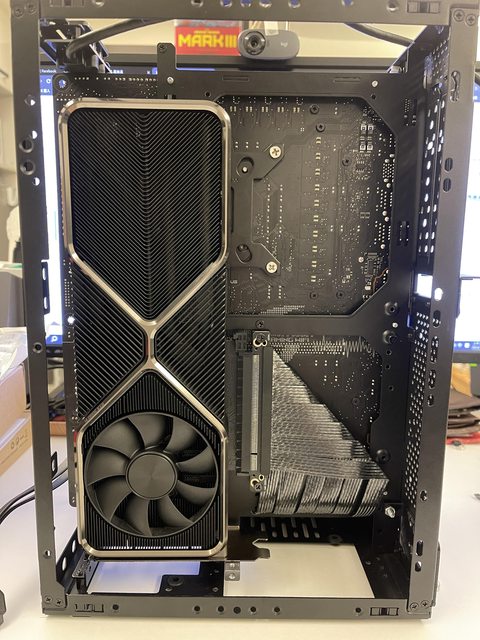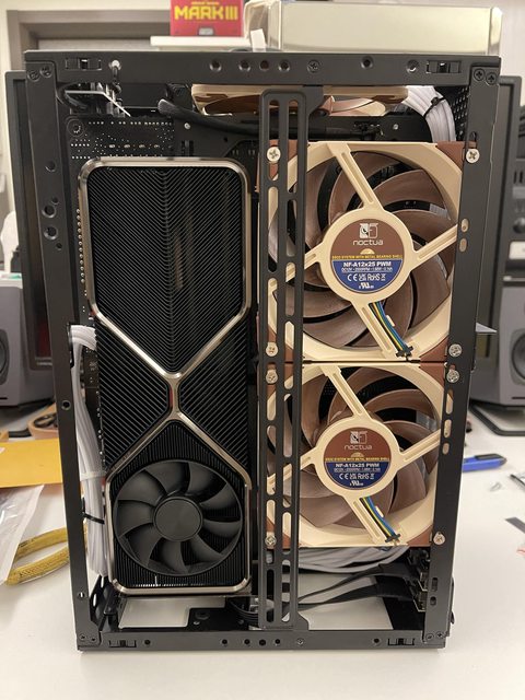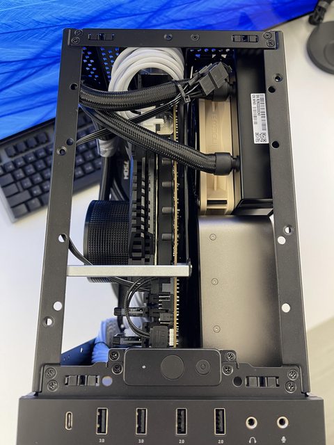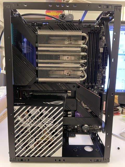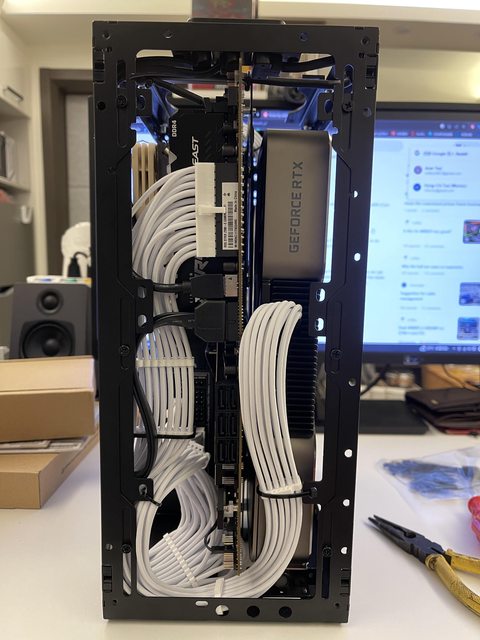 小弟也分享一下把ATX塞進ITX機殼的掙扎(痛苦)過程 一開始的規格如下: : CPU (中央處理器):i9-11900KF : MB (主機板):ROG STRIX Z590-F GAMING WIFI : RAM (記憶體):Kingstone FURY Beast RGB DDR4 16GB*2 : SSD (固態硬碟):Kingstone FURY Renegade PCIE 4.0 2TB : VGA (顯示卡):RTX 3080 ti Founders Edition : Cooler (散熱器):利民 apx120 + 貓頭鷹 a1215 : PSU (電源供應器):ROG Loki SFX-L 750W 可能有人會問下壓式壓的住i9嗎? -> 恩...壓不太住XD 跑2077常態在87~90度,一直過熱被降頻沒辦法穩定5Ghz以上。 組裝圖: https://i.imgur.com/8rIfVav.jpg