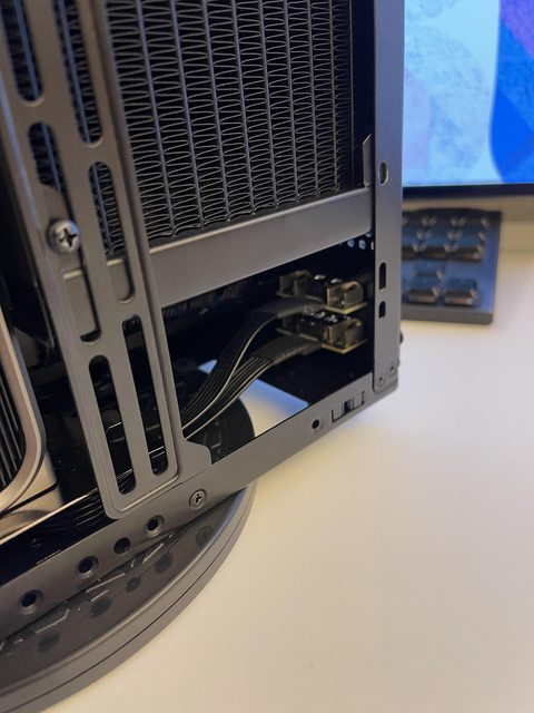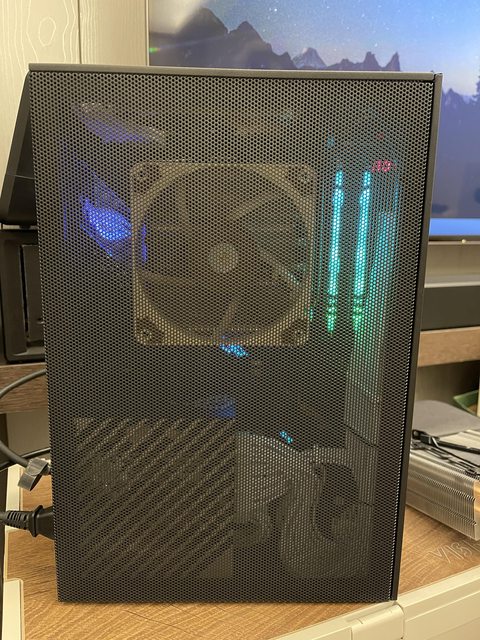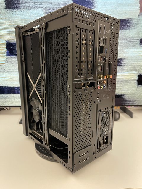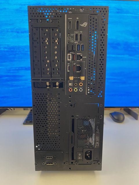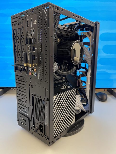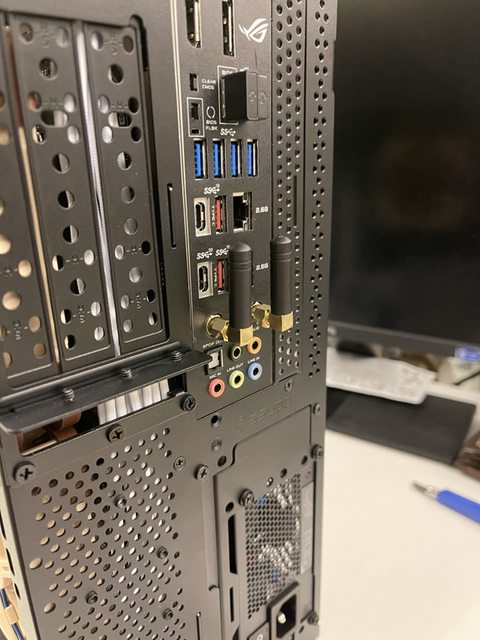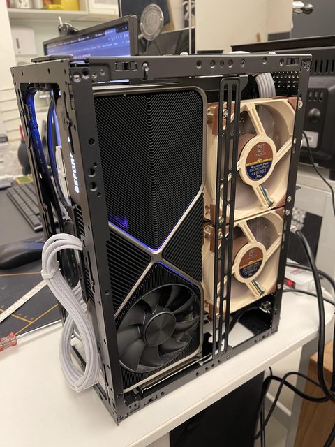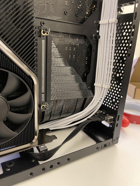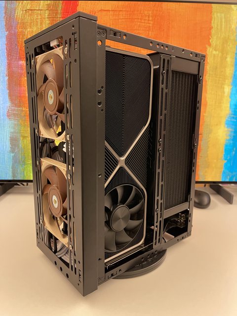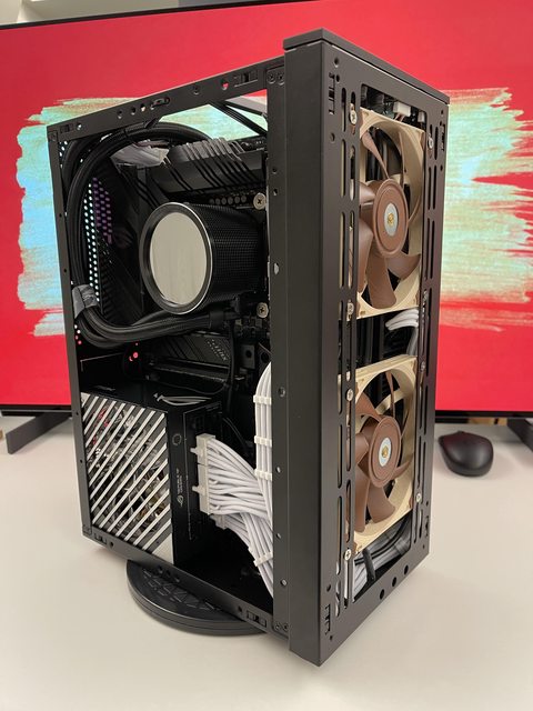 小弟也分享一下把ATX塞進ITX機殼的掙扎(痛苦)過程 一開始的規格如下: : CPU (中央處理器):i9-11900KF : MB (主機板):ROG STRIX Z590-F GAMING WIFI : RAM (記憶體):Kingstone FURY Beast RGB DDR4 16GB*2 : SSD (固態硬碟):Kingstone FURY Renegade PCIE 4.0 2TB : VGA (顯示卡):RTX 3080 ti Founders Edition : Cooler (散熱器):利民 apx120 + 貓頭鷹 a1215 : PSU (電源供應器):ROG Loki SFX-L 750W 可能有人會問下壓式壓的住i9嗎? -> 恩...壓不太住XD 跑2077常態在87~90度,一直過熱被降頻沒辦法穩定5Ghz以上。 組裝圖: https://i.imgur.com/8rIfVav.jpg