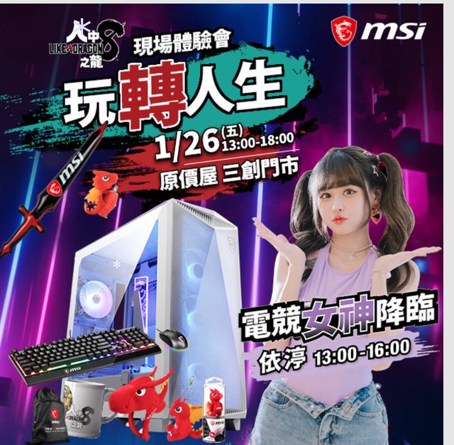 慶祝合作,MSI與SEGA將於2024年1月26日下午一點至六點,在原價屋三創旗艦店舉辦『全新競化 玩轉人生 』體驗會。現場將由電競女神依渟帶領玩家搶先體驗華麗的RPG戰鬥。參與活動並購買MSI Z790主機板的玩家不僅可獲得《人中之龍8》PC數位版(Steam)免費下載序號,還有機會獲得Vigor GK30 COMBO電競鍵盤滑鼠組、《人中之龍8》紀念馬克杯等精美好禮。