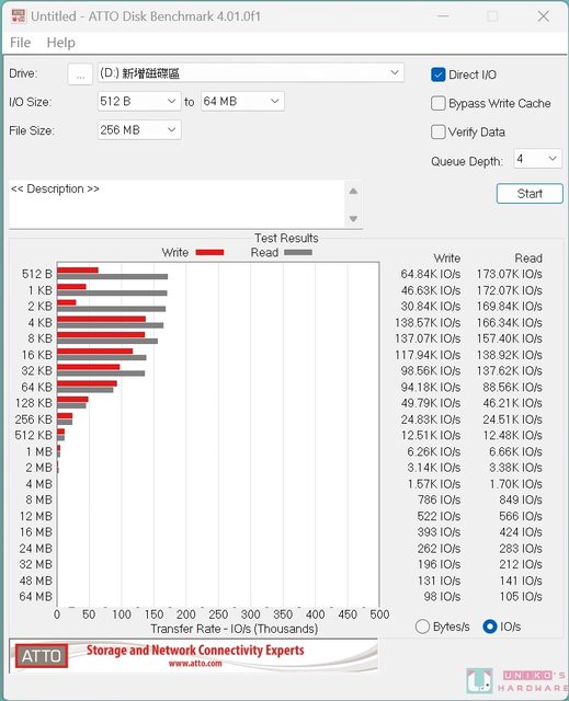 2 B ~ 64 KB 大約在 88.56 K IO/s ~ 173.07 K IO/s,IO 寫入區塊 512 B ~ 64 KB 大約
