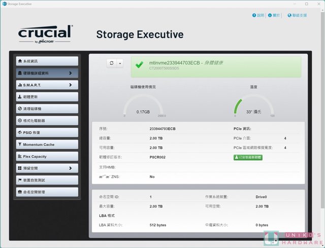 Crucial SSD 均可透過自家的 Storage Executive 工具,來監控 SSD 健康度、溫度、空