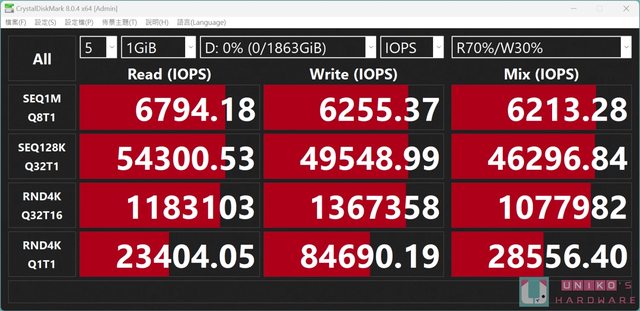 54300.53、寫入 49548.99;4K Q32T16 讀取 1183103、寫入 1367358。
