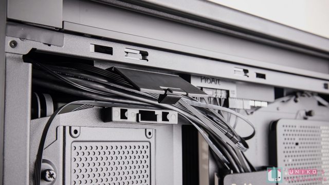 遮罩。背面有預先安排好的走線位置及固定線材的魔鬼氈,儲存擴充最多支援 8 顆 2.5