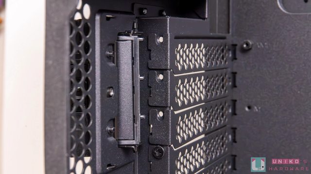 下方電源艙遮罩上留有 12VHPWR / 顯示卡電源走線孔,同時還有顯示卡直立鎖孔,電源供