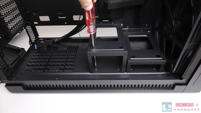 此處有硬碟支架,假如用不到也可以拿掉換取更大的整線空間,最後記得將遮罩安裝回去,