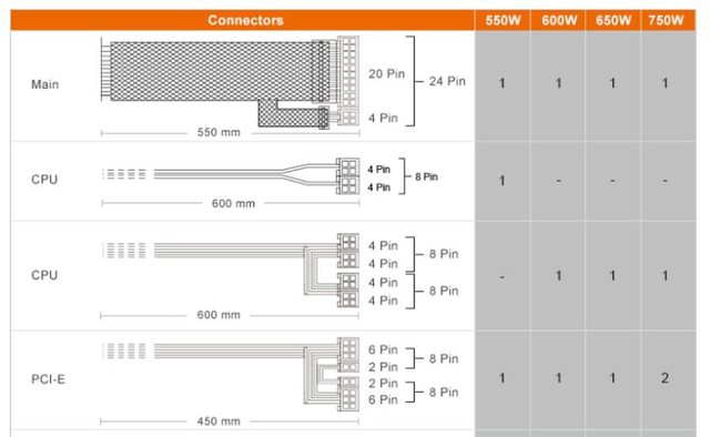 依官方規格表,ATLAS系列電源到750W才會提供2條PCI-E 8+8P線材,但目前台灣沒有販售