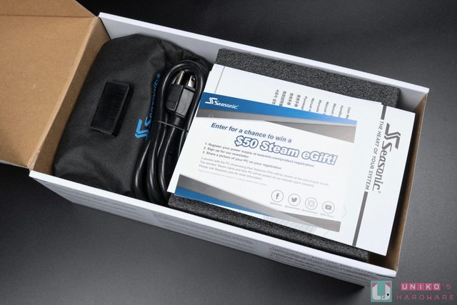 盒內有說明書、保固等文件,還有束帶、魔鬼氈、跳線開機接頭與一條電源線,並以泡棉包