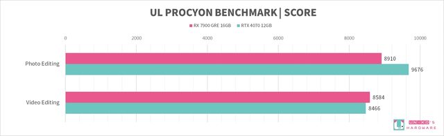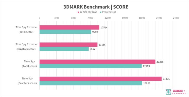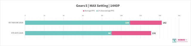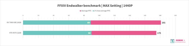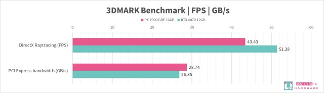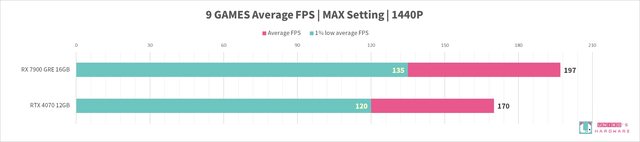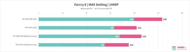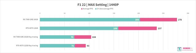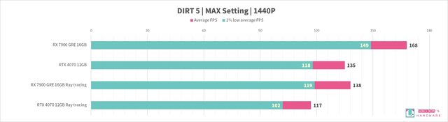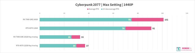 我們實際測試,觀察整體 RX 7900 GRE 性能是贏過 RTX 4070 的,在光追性能上也略贏一