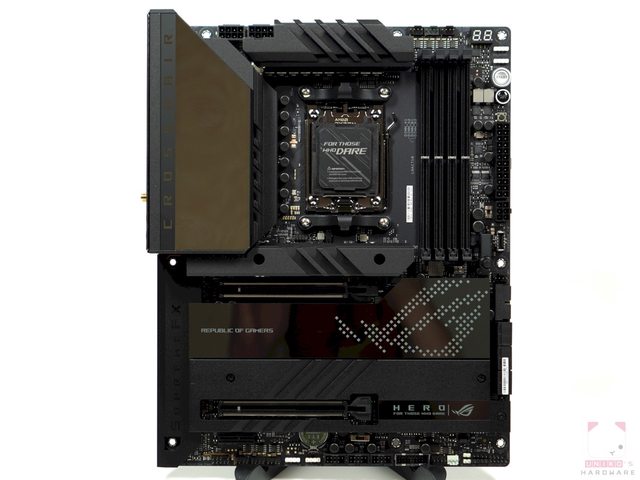 金屬背板覆蓋了整塊 PCB,右邊有一隻暗黑犬和一個不小的垂直排風切口。