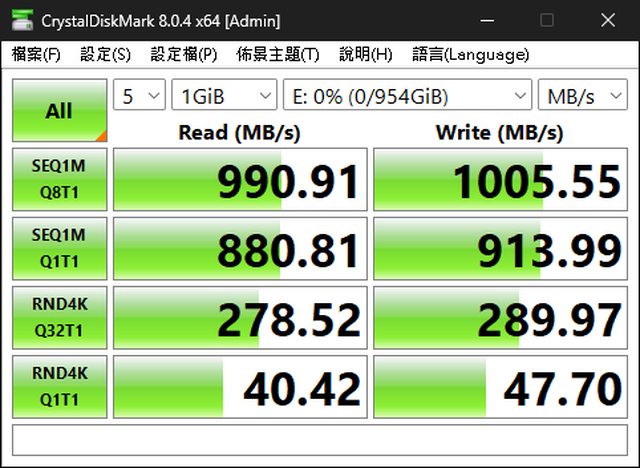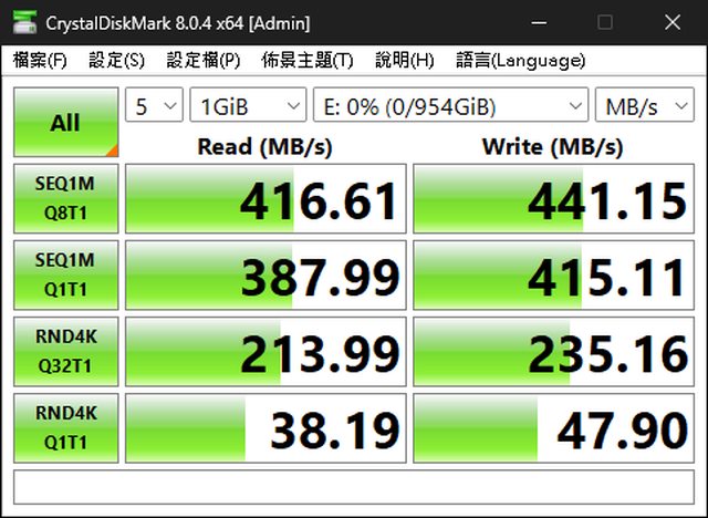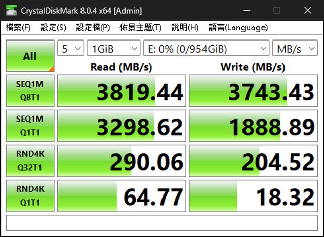 所以就簡單跑一下CrystalDiskMark全預設,和傳一個128G的單一大檔案