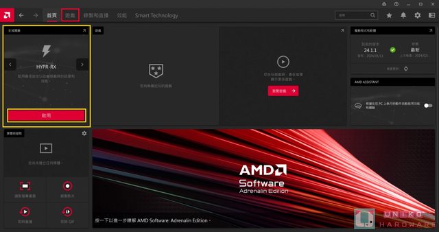 黃框全域體驗的位置直接啟用 HYPR-RX,詳細設定與單獨啟用 AFMF 可以前往紅框"遊戲"