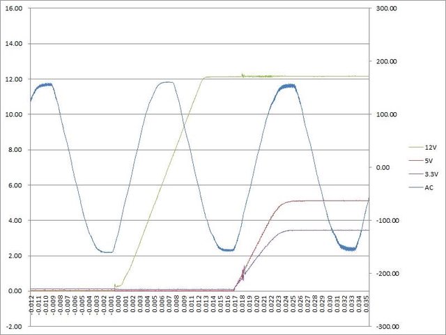 ○電源啟動至綜合全負載輸出狀態,12V上升時間13ms,5V上升時間8ms,3.3V上升時間