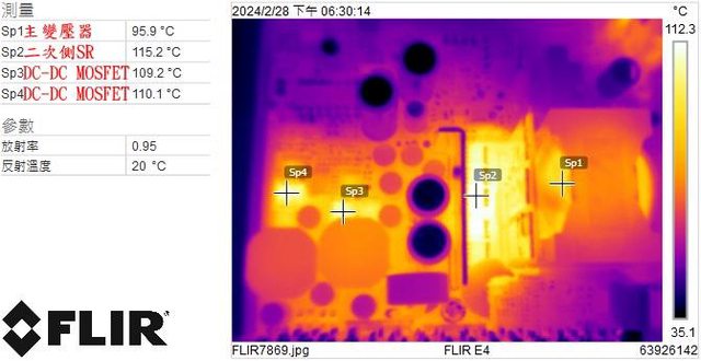 ▼電源供應器滿載輸出下主變壓器/二次側SR/DC-DC MOSFET的紅外線熱影像圖(附註:安