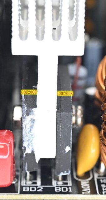 ▼2個並聯的GBU2008橋式整流器固定在散熱片的兩個面上