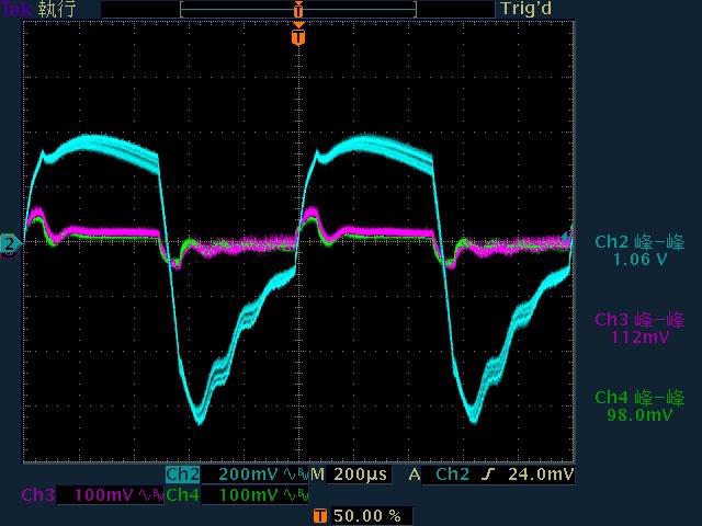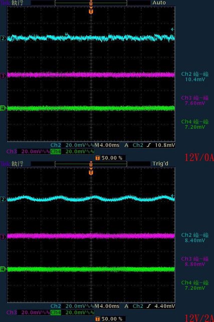 ○輸出無負載時12V有小振幅低頻漣波,輸出12V/2A以上12V漣波波形固定,只改變振幅。
