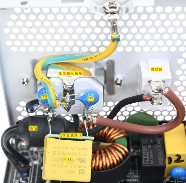 ▼白色交流輸入插座焊點加上2個Y電容(CY1/CY2)及1個X電容(CX1),X電容底部加上有X電