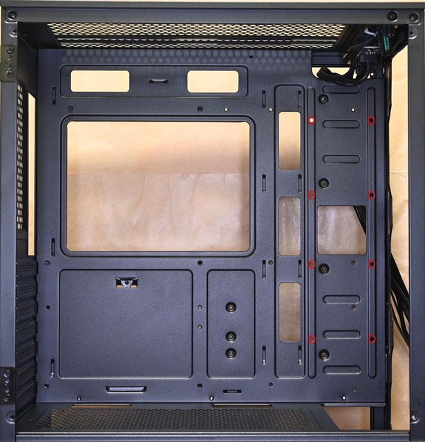 ▼機殼左側配置圖,主機板/介面卡安裝區與電源艙採隔離設計。底板上方/前端設有穿線