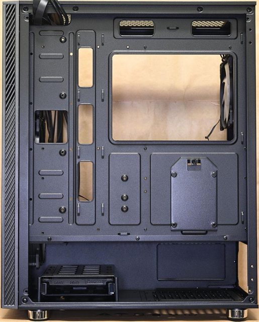 ▼後方預裝1個120mm ARGB主控風扇,主機板安裝底板上方鏤空,方便拆裝CPU散熱器背板
