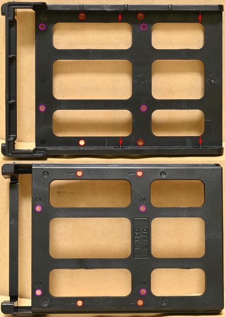 ▼底部3.5吋/2.5吋固定架頂部有3.5吋裝置(紅色框)及2.5吋裝置(紫色框)固定孔,內部