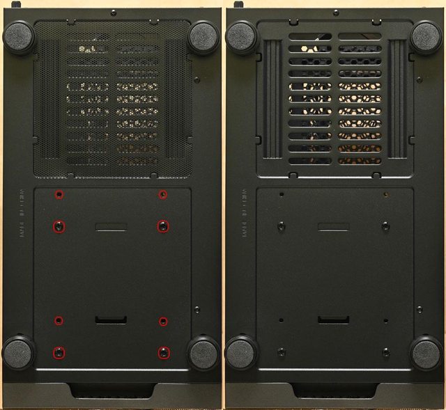 ▼機殼底部圓柱腳座有防滑墊,底部電源進氣口配置嵌入式過濾網,螺絲固定的底部3.5
