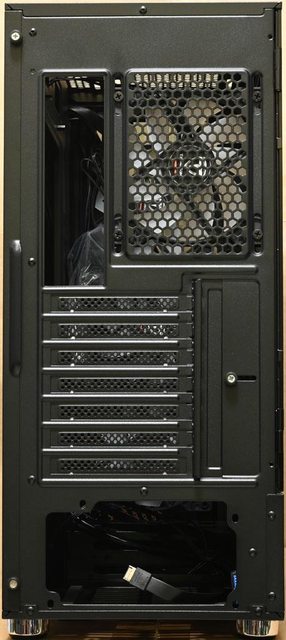 ▼後方右上通風口可裝1個120mm風扇,擴充槽上方蓋板使用手轉螺絲固定,下方電源供應