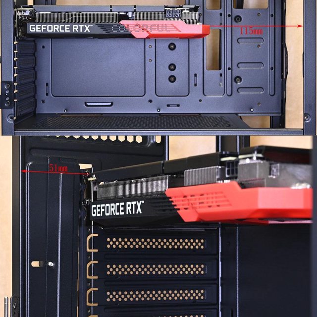 端距離正面115mm(未安裝風扇/水冷排),顯示卡頂部距離左側51mm
