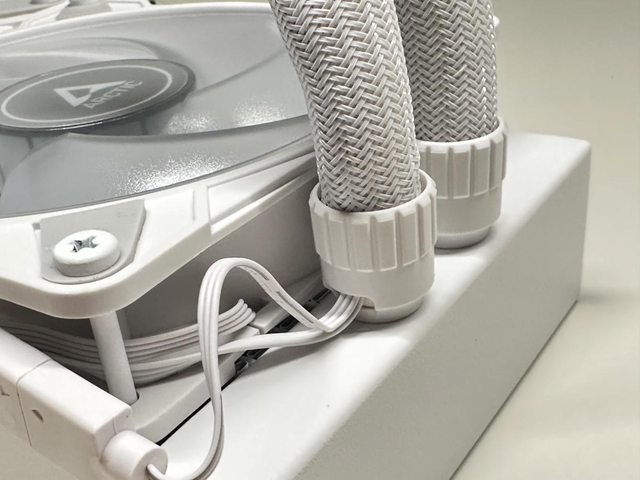 風扇電源線及5V ARGB線材皆經冷水管連接至冷頭。經整合後所有線材皆從水冷頭連接,