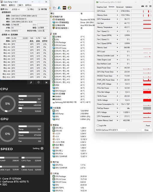 ▼CPU+GPU高負載前的Core Temp、AIDA64感測器、GPU-Z感測器畫面
