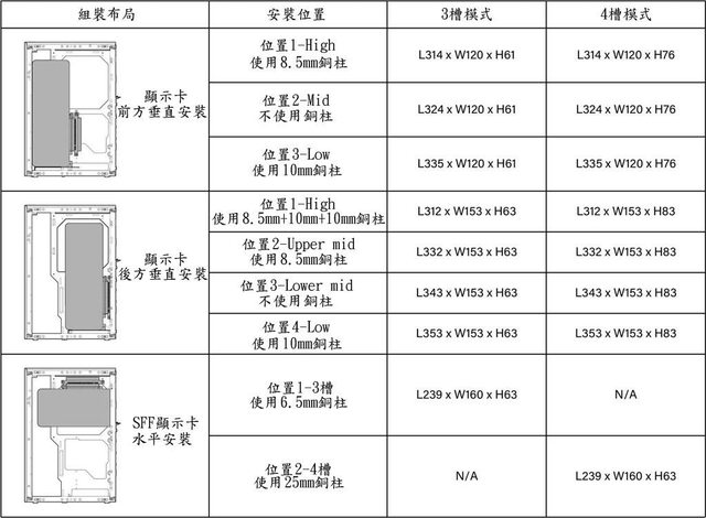 ▼不同組裝布局下顯示卡最大尺寸如下表