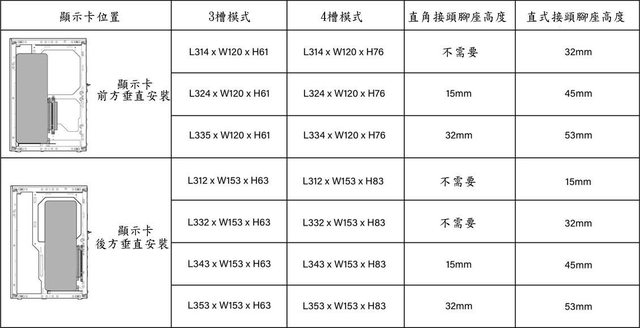 120mm,搭配額外腳座下長325mm寬120mm;2.8槽(57mm)顯示卡前方垂直安裝下長314mm寬