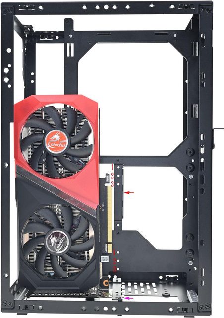 ▼顯示卡前方垂直安裝的底部圖,擋板頂部固定架的鎖點(紅色箭頭)及底部托架的鎖點(