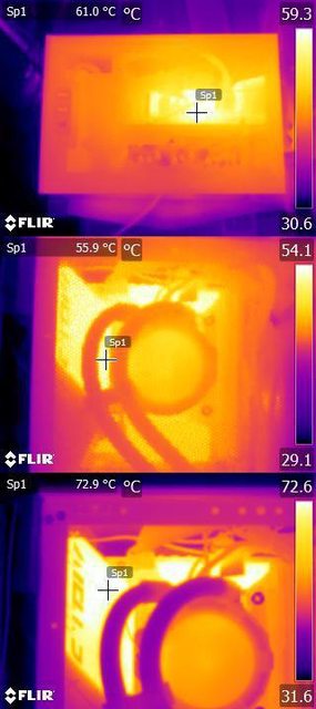 ▼CPU+GPU高負載30分鐘後的機殼頂部/左側上方/主機板VRM紅外線熱影像圖