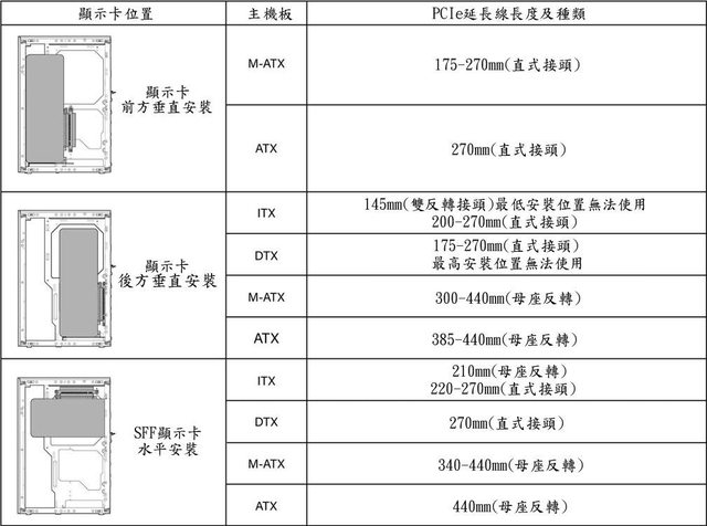 器/風扇安裝配置,並依照內部配置選擇合適的PCIe延長線及配件,因為會彼此影響內部