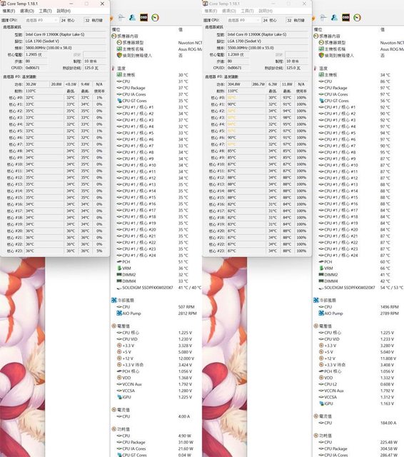 ▼功耗限制300W下待機(左)及高負載(右)的CORE TEMP及AIDA64感測器畫面