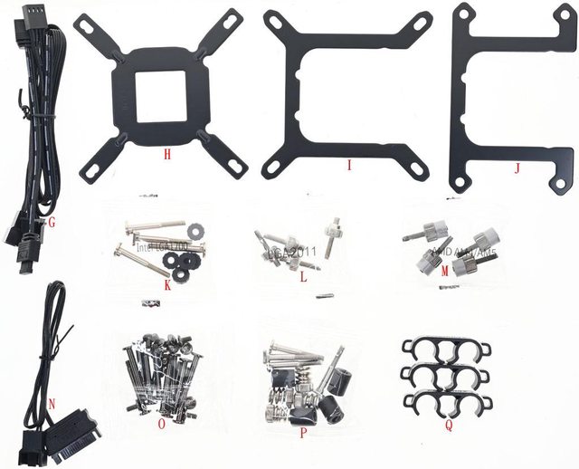 針轉接線(N)、水冷排固定用短螺絲/風扇固定用長螺絲(O)、LGA1200/115x/1366螺柱/套
