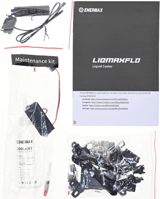 ▼包裝內容物有ENERMAX LIQMAXFLO 420一體式水冷散熱器(A)、3個UCSFARGB14P-LMF風扇