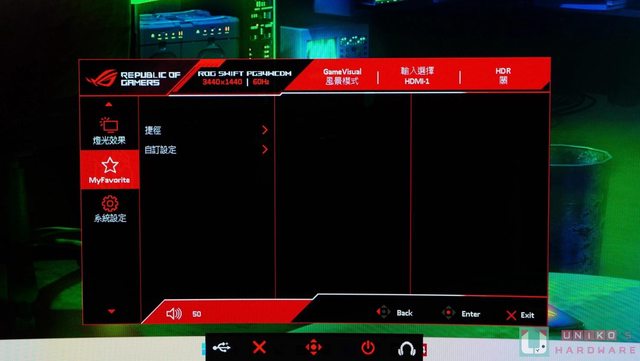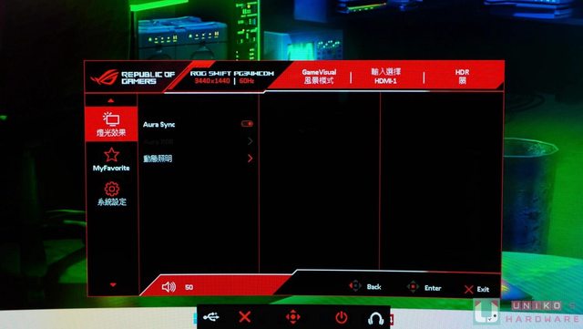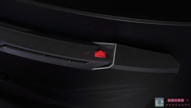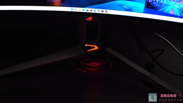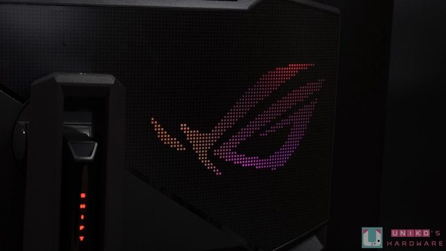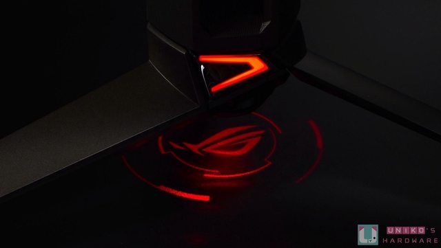 AURA SYNC 在顯示器底部透光投射出最經典的紅色 ROG 敗家之眼,身為粉絲的我們在感動