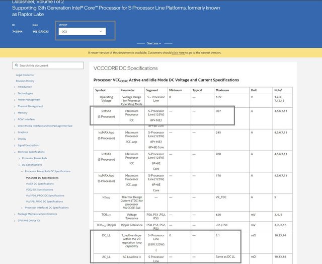 只寫上 S PROCESSOR LINE (13TH) 的 AC_LL 最大是 1.1,在最新的 009 版本裡 INTEL 是