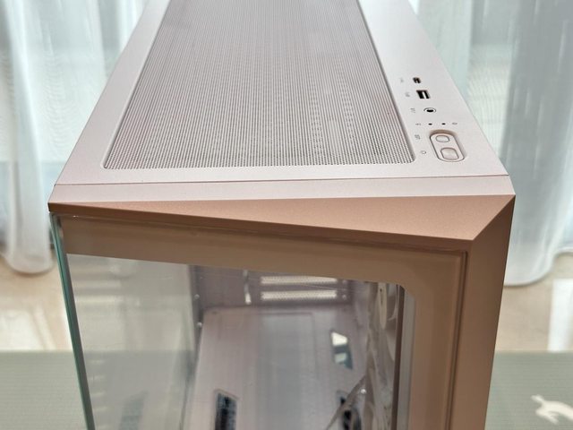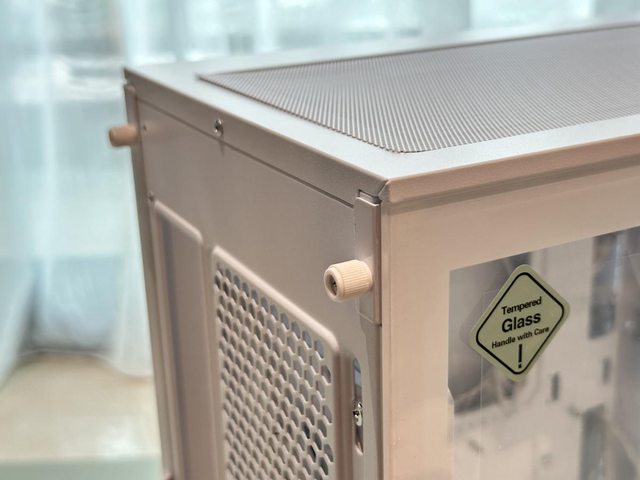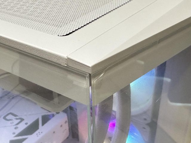 裝機時個人也發現了外觀的些微遺憾,兩片玻璃側板銜接處採用斜角裁切設計,但交界處