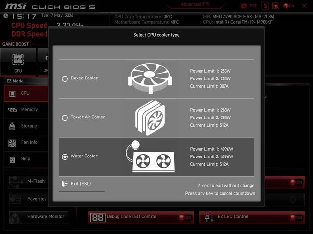 選擇 CPU COOLER TUNING 的 BOXED COOLER 模式來確保 PL1、PL2、ICCMAX 都不超出 INTE