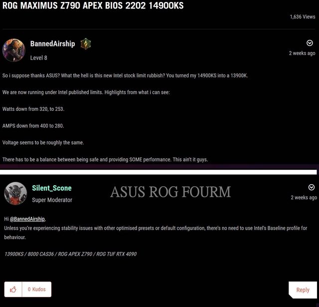 INTEL 在回應中提到"BIOS default settings guidance"和"default BIOS profile",