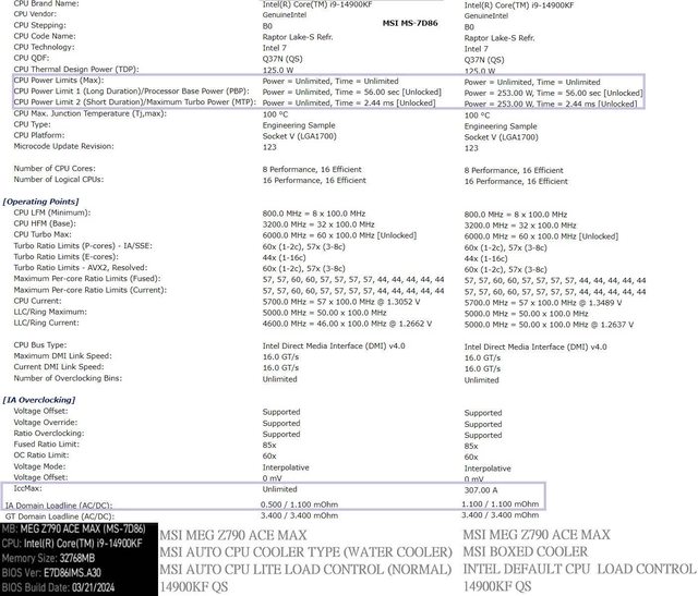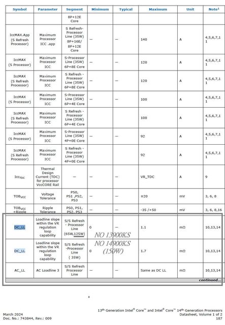 14900K / 14900KF 在無功率和電流限制時,加上板廠會降低預設的 AC_LL (<1.1),14900K